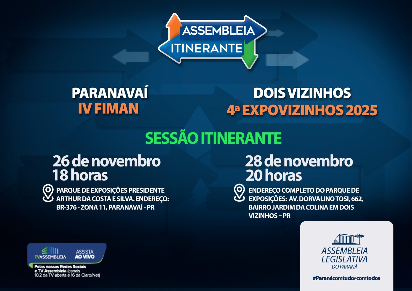 A Assembleia Legislativa vai rodar todos os principais municípios do interior do Estado. O programa Assembleia Itinerante vai levar o trabalho do legislativo para os grandes eventos populares do Paraná. O objetivo é aproximar cada vez mais os parlamentares da população, recebendo propostas, iniciativas, sugestões e demandas de todas as regiões.