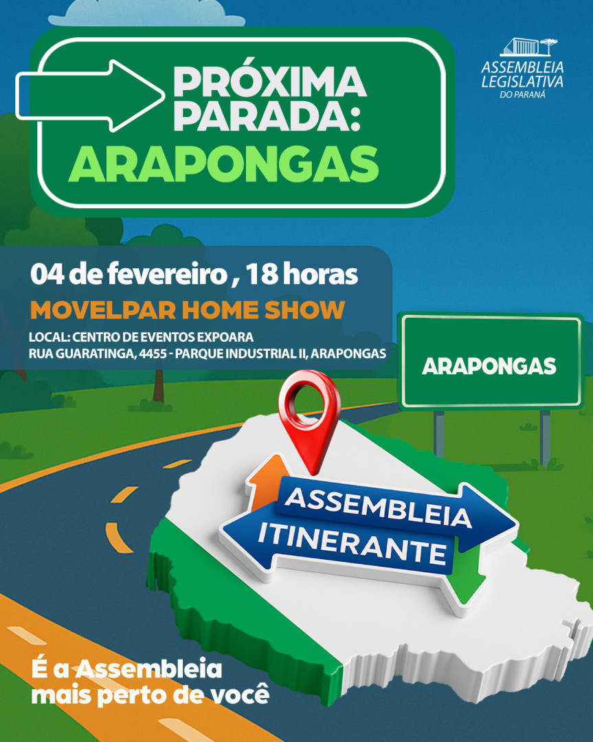 O município de Arapongas, no norte do Paraná, recebe nesta quarta-feira (4) a primeira Assembleia Itinerante de 2026, programa de interiorização da Assembleia Legislativa do Paraná. Essa é a 37ª edição do evento e a terceira passagem dos parlamentares estaduais em Arapongas para ouvir as demandas e homenagear personalidades e entidades locais. A sessão solene está marcada às 18h, na Movelpar Home Show, no Centro de Eventos Expoara.