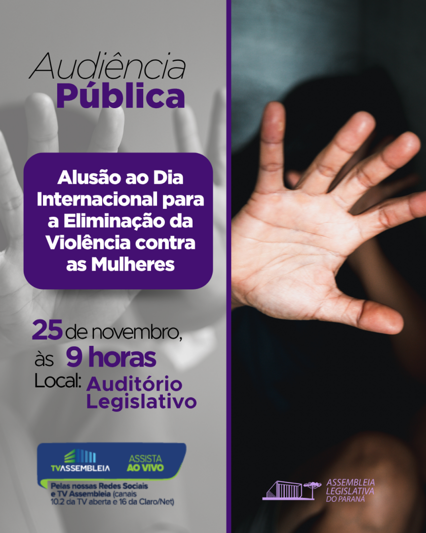 A Assembleia Legislativa do Paraná promove, na próxima terça-feira (25), às 9 horas, no Auditório Legislativo, a Audiência Pública pela Eliminação da Violência Contra a Mulher, iniciativa proposta pela deputada cantora Mara Lima (Republicanos), presidente da Comissão de Defesa dos Direitos da Mulher. O encontro integra as ações do Dia Internacional da Eliminação da Violência Contra a Mulher e reforça o compromisso da parlamentar com políticas de proteção, prevenção e acolhimento.