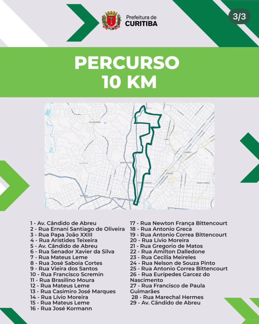 Conforme a Prefeitura de Curitiba, os bloqueios temporários estão programados para o período das 4h às 11h de domingo. A Corrida da Assembleia Legislativa contará com dois percursos — de 5 km e 10 km. O trajeto terá acompanhamento de agentes e monitores de trânsito, e haverá bloqueios temporários para garantir a segurança de todos.