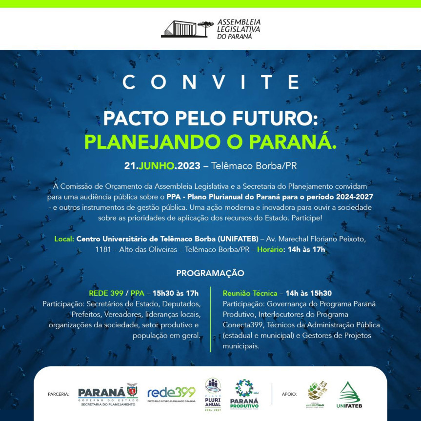 O encontro da Rede399 - Pacto pelo futuro: Planejando o Paraná é organizado pela Secretaria Estadual de Planejamento, em parceria com o legislativo estadual. No evento, além da discussão sobre a elaboração do PPA para o período de 2024 até 2027, haverá detalhamento dos programas realizado pelo Poder Executivo, como o Paraná Produtivo (Fase II) e Conecta399.