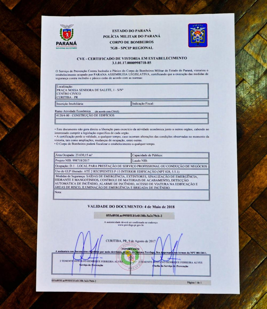 A Assembleia Legislativa do Paraná (Alep) recebeu o Certificado de Vistoria do Corpo de Bombeiros nesta quarta-feira (16), durante a sessão plenária. O documento foi entregue pelo comandante da corporação, coronel Fábio Mariano de Oliveira, à Comissão Executiva. Após quinze meses do processo de readequação às normas de segurança, de combate a incêndio, evacuação de área e atendimento em situações de pânico, além de mudanças estruturais realizadas nos três prédios que compõem o Legislativo estadual, a formação da Brigada de Incêndio, concluída na última semana, finalizou o cronograma exigido para o atestado de completa regularidade pelo Corpo de Bombeiros.