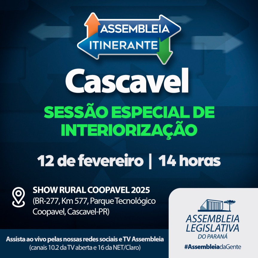 A Assembleia Itinerante desembarca pela primeira vez em Cascavel. O projeto da Mesa Executiva do Poder Legislativo criado para ouvir as demandas da sociedade nas principais cidades do Estado promove no dia 12 de fevereiro um grande evento para receber as reivindicações e homenagear personalidades do município e região. A 17ª sessão especial interiorização da Assembleia Legislativa do Paraná será realizada a partir das 14 horas, durante o 37º Show Rural Coopavel 2025, que ocorre entre os dias 10 a 14 de fevereiro no Parque Tecnológico de Cascavel.