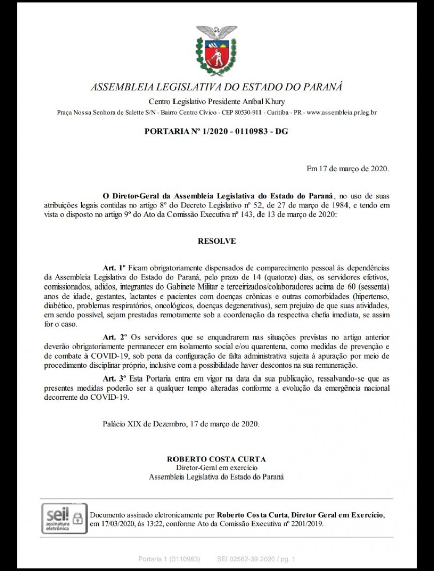 Em razão da necessidade de garantir a prevenção ao contágio pelo coronavírus nas dependências da Assembleia Legislativa do Paraná, nesta terça-feira (17) a Comissão Executiva emitiu a portaria 1/2020, assinada pelo Diretor-Geral em exercício Roberto Costa Curta, com novas determinações em relação aos servidores do Legislativo.