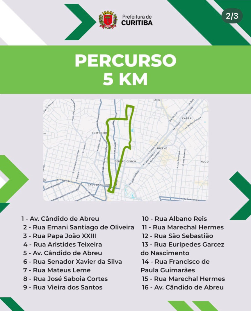 Conforme a Prefeitura de Curitiba, os bloqueios temporários estão programados para o período das 4h às 11h de domingo. A Corrida da Assembleia Legislativa contará com dois percursos — de 5 km e 10 km. O trajeto terá acompanhamento de agentes e monitores de trânsito, e haverá bloqueios temporários para garantir a segurança de todos.
