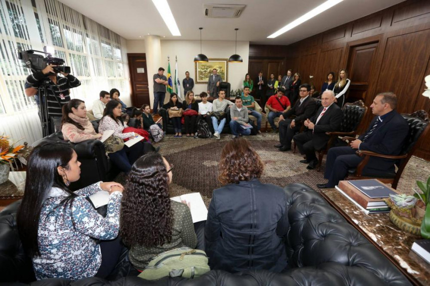 O presidente da Assembleia Legislativa, deputado Ademar Traiano (PSDB), recebeu na tarde desta terça-feira (7), no Gabinete da Presidência, alunos do curso de Ciências Contábeis do Instituto Federal do Paraná (IFPR). Durante o encontro, os universitários fizeram perguntas ao presidente e tiraram dúvidas sobre o trâmite dos projetos de lei, sobre o processo legislativo e as demais atividades da Casa.
