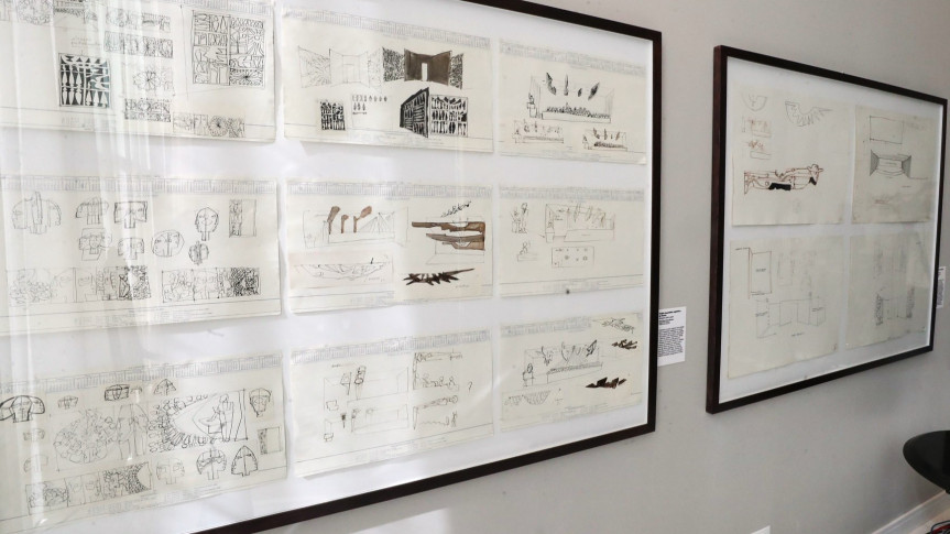 Desenhados em papéis de calendário com amplos espaços brancos e o aviso “risque e rabisque”, há esboços que detalham a criação do painel "Sol, pinhão e três planaltos"; e do amplo mural de concreto aparente "Símbolos do Paraná", ambos presentes no térreo do edifício. Também estão expostos os rascunhos que resultaram nos entalhes de madeira batizados de “Ceifador” -  inicialmente previstos para compor a Tribuna de Honra, e que hoje estão na entrada do Plenário. Por fim, há ainda os traçados iniciais de “Assembleia”, o imenso mural de madeira do Plenarinho que faz uma leitura da política no Paraná.