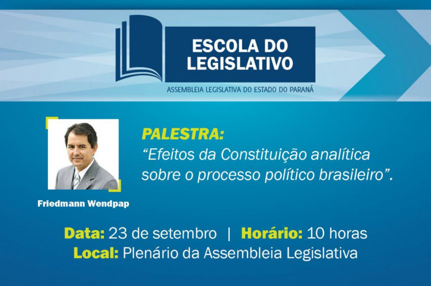 O juiz federal Friedmann Wendpap é o convidado do próximo evento que será promovido pela Escola do Legislativo da Assembleia Legislativa do Paraná. Com o tema “Efeitos da Constituição Analítica Sobre o Processo Político Brasileiro”, Wendpap ministrará palestra aberta ao público em geral, na quarta-feira (23), a partir das 10 horas, no Plenário do Legislativo estadual.