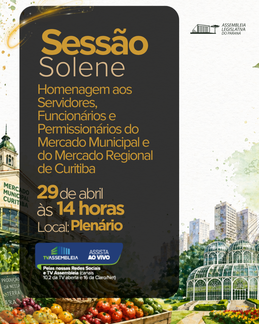 A Assembleia Legislativa do Paraná promove, na próxima quarta-feira (29), uma sessão solene em homenagem aos funcionários e permissionários do Mercado Municipal de Curitiba e do Mercado Regional do Cajuru. A iniciativa foi proposta pelo deputado estadual Delegado Tito Barichello (PL) e está marcada para as 18h30, no Plenário, com o objetivo de reconhecer o trabalho dos profissionais que garantem o funcionamento e a relevância econômica e social desses espaços tradicionais da capital paranaense.