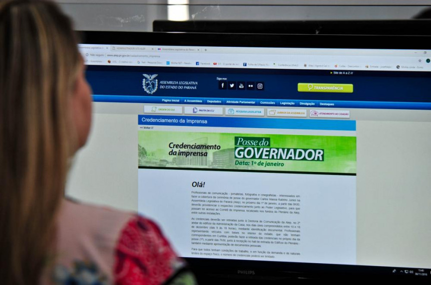 Profissionais de comunicação - jornalistas, fotógrafos e cinegrafistas - interessados em fazer a cobertura da cerimônia de posse do governador Carlos Massa Ratinho Junior na Assembleia Legislativa do Paraná (Alep), no próximo dia 1º de janeiro, a partir das 8h30, deverão providenciar o respectivo credenciamento junto ao Poder Legislativo, para que possam ter acesso ao Comitê de Imprensa, localizado nos fundos do Plenário da Alep, entre outras instalações. O credenciamento é feito diretamente no site da Alep, em http://www.alep.pr.gov.br/cadastramento_imprensa