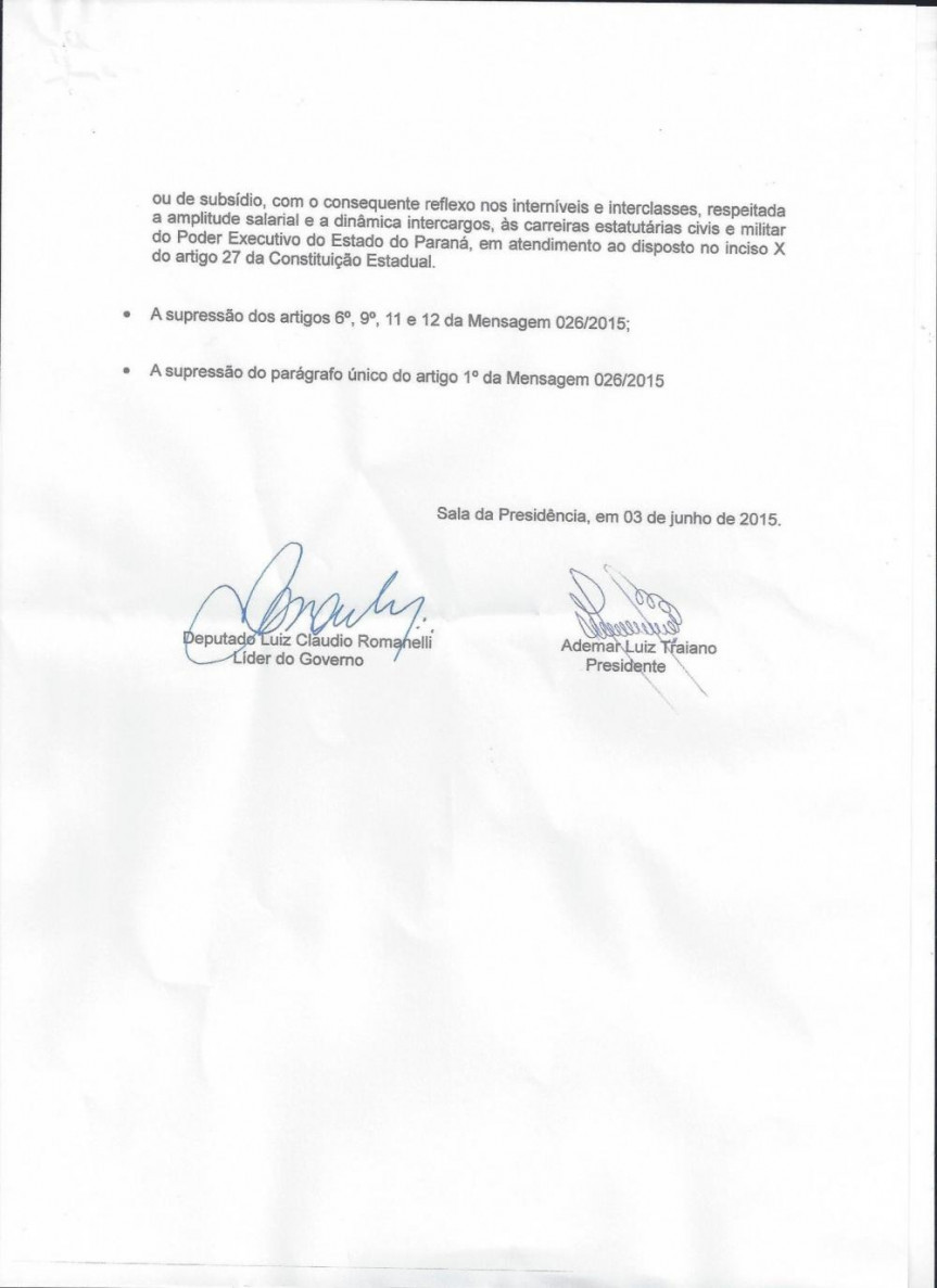 O presidente da Assembleia Legislativa, deputado Ademar Traiano (PSDB), junto com o líder do Governo Luiz Cláudio Romanelli (PMDB), voltou a reunir os deputados de situação e oposição na Presidência da Casa no início da tarde desta quarta-feira (3) para mais uma rodada de negociações com o objetivo de romper o impasse que mantém os professores da rede estadual em greve há mais de 30 dias no Paraná. Uma proposta que estabelece uma política salarial com reposição das perdas salariais do funcionalismo do período de maio de 2015 a maio de 2018 e garante ganhos reais foi assinada por Traiano e Romanelli, que conduziram as negociações em nome do Governo do Estado, e entregue às lideranças do Fórum dos Servidores Públicos do Paraná.