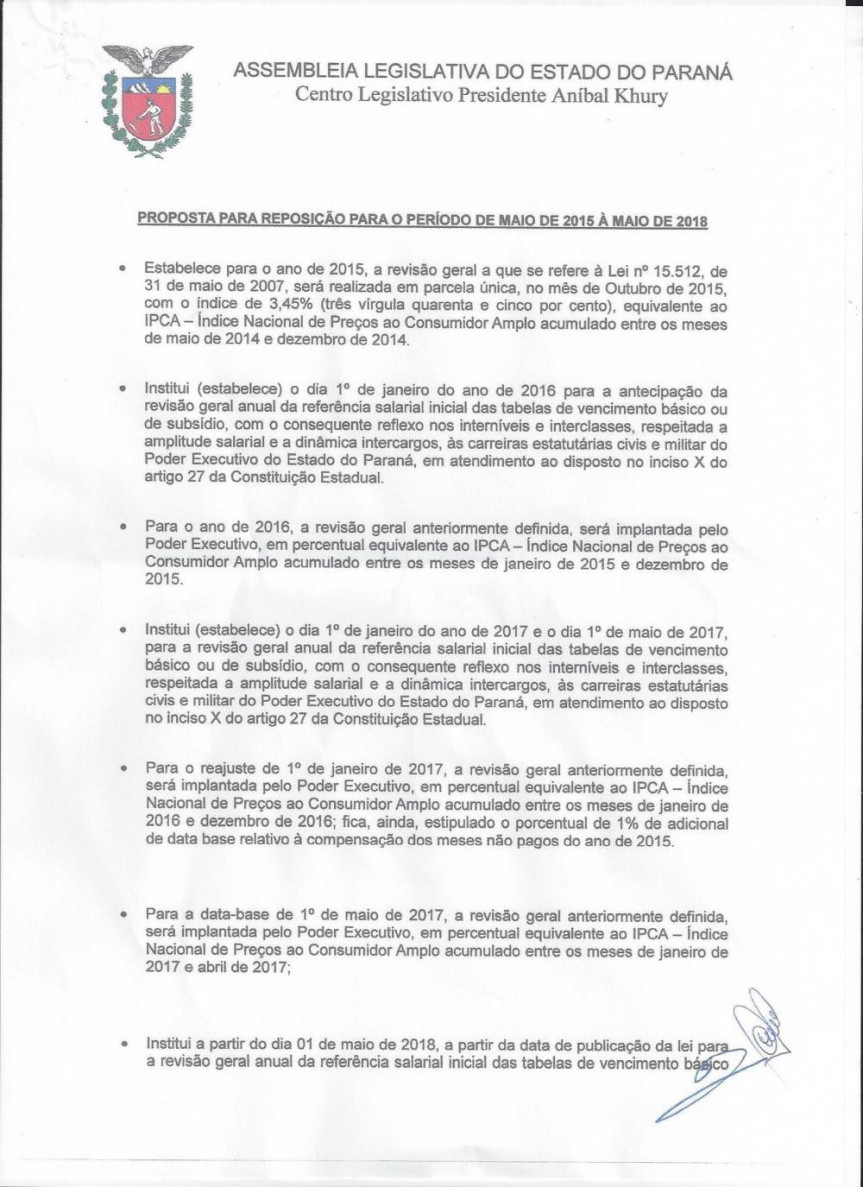 Romanelli explicou que a proposta prevê uma solução para os próximos três anos e não implicará em perdas salariais para os professores e demais funcionários. Ela estabelece para o ano de 2015 a aplicação de um reajuste de 3,45% no mês de outubro e institui o dia 1º de janeiro de 2016 como data para a antecipação da revisão geral anual da categoria. E para o reajuste de 1º de janeiro de 2017 será aplicado o IPCA acumulado entre os meses de janeiro de 2016 e dezembro de 2016, ficando ainda estipulado o percentual de 1% de adicional de data base relativo à compensação dos meses não pagos do ano de 2015 (Confira a íntegra da proposta no documento anexo). O líder do Governo acredita que, em um cenário ideal, se a proposta for aceita pelos servidores, ela será debatida ainda no sábado e as aulas poderão ser retomadas na segunda-feira.