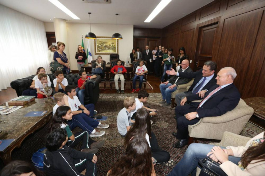 O presidente da Assembleia Legislativa, deputado Ademar Traiano (PSDB), e o 1º secretário da Casa, deputado Plauto Miró (DEM), receberam na tarde desta terça-feira (27), no Gabinete da Presidência, estudantes que participam da Câmara Mirim de Irati, projeto elaborado pelo Legislativo daquele município com objetivo de estimular a formação de cidadãos responsáveis, éticos e politicamente atuantes, conscientes de seus direitos e deveres.